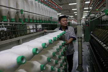 圖為恒新公司后紡車間丙班東廠房生產(chǎn)組長馬子天落完紗后又準(zhǔn)備換段。